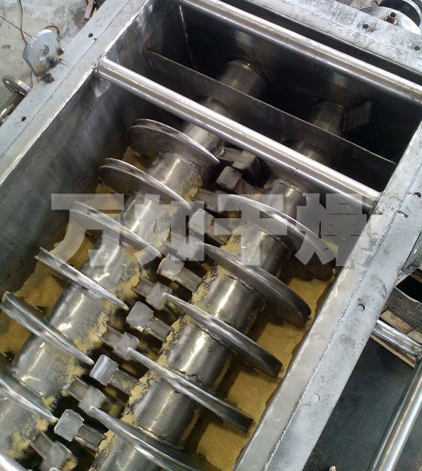 空心轴上密集排列着楔型中空浆叶,热介质经空心轴流经浆叶。单位有效容积内传热面积很大,热介质温度从-40℃到320℃,可以是水蒸汽,也可以是液体型:如热水、导热油等。间接传导加热,没有携带空气带走热量,热量均用来加热物料。热量损失仅为通过器体保温层向环境的散热。楔型浆叶传热面具有自清洁功能。物料颗粒与楔型面的相对运动产生洗刷作用,能够洗刷掉楔型面上附着物料,使运转中一直保持着清洁的传热面。浆叶干燥机的壳体为Ω型,壳体内一般安排二到四根空心搅拌轴。壳体有密封端盖与上盖,防止物料粉尘外泄而充分发挥作用。