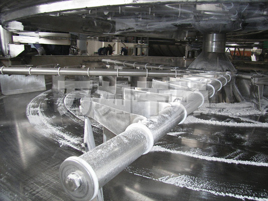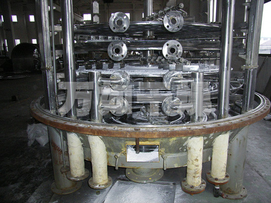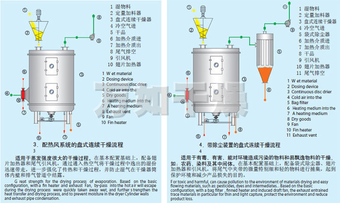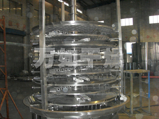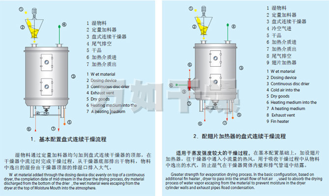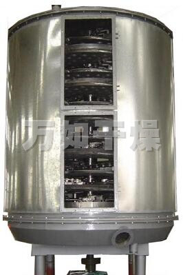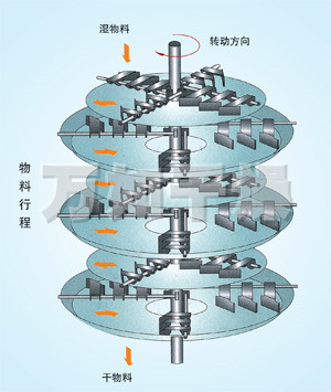 湿物料自加料器连续地加到干燥器上部第一层干燥盘上,带有耙叶的耙臂作回转运动使耙臂作回转运动使耙叶连续地翻抄物料。物料沿指数螺旋线流过干燥盘表面,在小干燥盘上的物料被移送到外缘,并在外缘落到下方的大干燥盘外缘,在大干盘上物料向里移动并从中间落料口落如下一层小干燥盘中。大小干燥盘上下交替排列,物料得以连续地流过整个干燥器。中空的干燥盘内通入加热介质,加热介质形式有饱和蒸汽、热水和导热油,加热介质由干燥盘的一端进入,从另一端导出。已干物料从最后一层干燥盘落到壳体的底层,最后被耙叶移送到出料口排出。湿份从物料中逸出,由设在顶盖上的排湿口排出,真空型盘式干燥器的湿气由设在顶盖上的真空泵口排出。从底层排出的干物料可直接包装。通过配加翅片加热器、溶剂回收冷凝器、袋式除尘器、干料返混机构、引风机等辅机,可提高其干燥的生产能力,干燥膏糊状和热敏性物 料,可方便地回收溶剂,并能进行热解和反应操作。