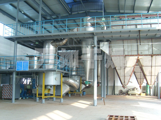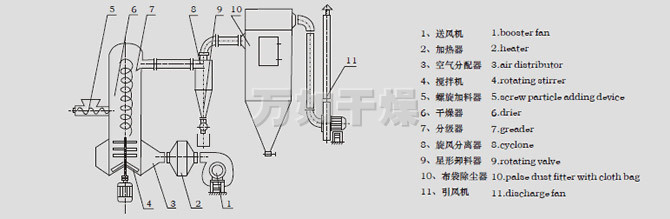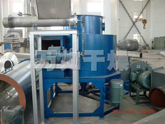 热空气切线进入干燥器底部,在搅拌器带动下形成强有力的旋转风场。膏状物料由螺旋加料器进入干燥器内,在高速旋转搅拌桨的强烈作用下,物料受撞击、磨擦及剪切力的作用下得到分散,块状物料迅速粉碎,与热空气充分接触、受热、干燥。脱水后的干物料随热气流上升,分级环将大颗粒截留,小颗粒从环中心排出干燥器外,由旋风分离器和除尘器回收,未干透或大块物料受离心力作用甩向器壁,重新落到底部被粉碎干燥。