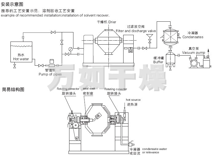◎物料处于真空状态,蒸汽压下降使物料表面的水份(溶剂)达到饱和状态而蒸发了,并由真空泵及时排出回收。物料内部的水份(溶剂)不断地向表面渗透、蒸发、排出三个过程不断进行,物料在很短时间内达到干燥目的。