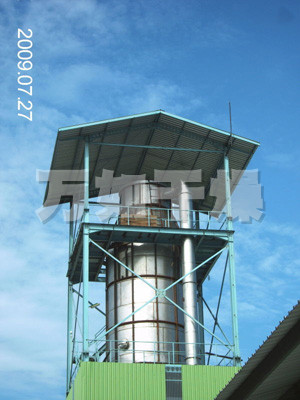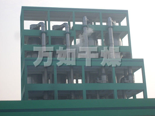 本机组工作过程为料液通过隔膜泵高压输入,喷出雾状液滴,然后同热空气并流下降,大部分粉粒由塔底排料口收集,废气及其微小粉末经旋风分离器分离,废气由抽风机排出,粉末由设在旋风分离器下端的授粉筒收集,风机出口还可装备二级除尘装置,回收率在96-98%以上。