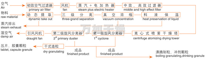 中药浸膏高速离心喷雾装置是离心式喷雾干燥技术在特定物料干燥中的应用,也是利用高速离心式雾化器使物料分散成雾状,与热空气充分接触,完成瞬间干燥,形成粉状成品的干燥装置。