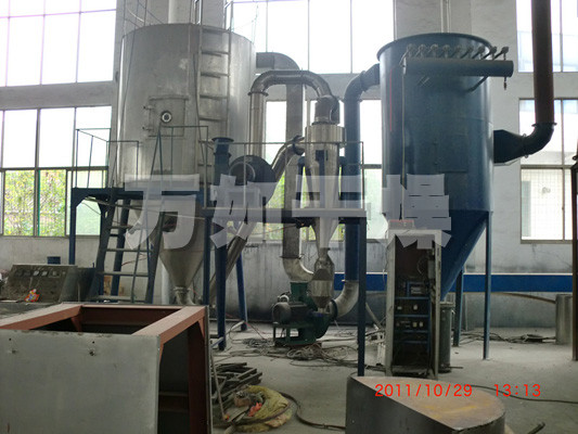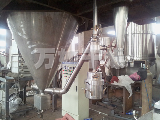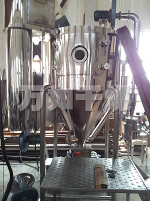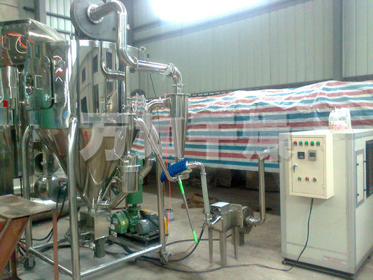 该机采用全封闭形式,所有部件均采用不锈钢制造,配有三级净化装置,过滤后的空气达十万级要求。筒体与顶部装有冷壁装置,使壁温<80℃,干燥塔内装有气刷扫塔装置。经该机干燥后的中药浸膏粉,不会出现焦化变质现象,大大增加了收粉率(95%以上),而且不会产生混药现象和粘壁现象。
