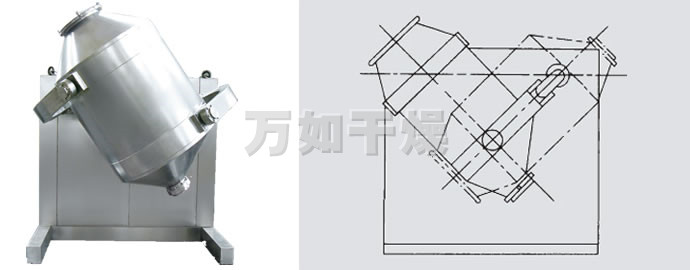 装料的筒体在主动轴的带动下,作周而复始的平移、转动和翻滚等复合运动,促使物料沿着筒体作三向复台运动,从而实现多种物料的互相流动、扩散、积聚、掺杂.以达到均匀混合的目的。