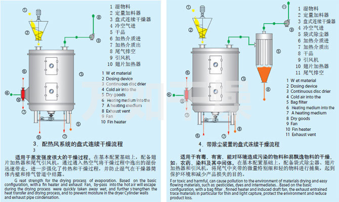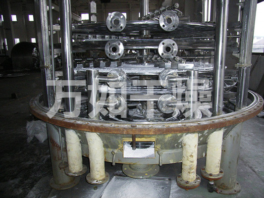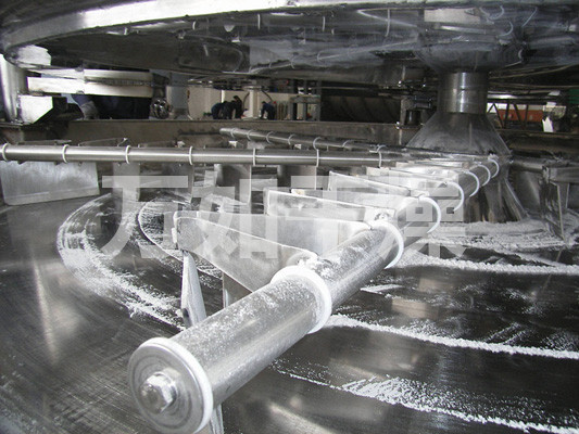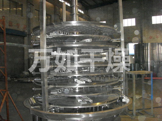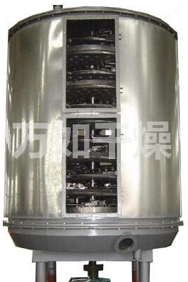 Wet material continuously fed from the feeder on the upper portion of the first layer of drying plate dryer with rake leaf rake arm rotary movement of the digging arm rotary movement so continuously rake leaves turn copied material. Index material along the spiral flow through the disk surface drying, the material was dried in a small disk is transferred to the outer edge, and falls below the outer edge of the large drying plate at the outer edge, on a big plate material moved inward and drop from the middle spout off as one small drying pan. Size drying plates are arranged alternately, the material can be continuous through the whole dryer. Heating medium through the hollow of the dry plate, heating medium in the form of saturated steam, hot water or thermal oil heating medium enters from one end of the dry plate exported from the other end. Dried materials fell on the bottom of the housing from the last layer of drying plate, the last being transferred to rake leaves out of the discharge port. The moisture escaping from the material discharged from the humidity on the top cover of the mouth, a vacuum-type plate dryer moisture is discharged by the vacuum pump on the top cover of the mouth. Discharged from the bottom of the dry materials can be packed directly. By finned heater with addition, solvent recovery condensers, baghouse, dry material backmixing agencies, induced draft fan and other auxiliary equipment, can increase its drying capacity, dried paste and heat sensitive materials can be easily recycled The solvent and capable of heat decomposition and reaction.