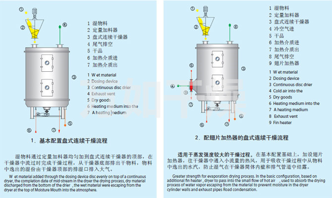 Disc continuous dryer is a highly efficient conduction of continuous drying equipment. Its unique structure and operating principle determines that it has high thermal efficiency, low energy consumption, small footprint, simple configuration, convenient control, good operating environment and other characteristics, widely used in chemical, pharmaceutical, pesticide, food, feed, farming product processing and other industries drying operation. Well received in various industries practice. Now manufacturing pressure, sealed, vacuum three types, 1200,1500,2200,3000 four kinds, A (carbon steel), B (contact material part of the uniform stainless steel), C (on the basis of B to increase the steam pipe Road, spindle and bracket stainless steel, lined with stainless steel barrel and cap top). Three materials, dry area 4 ~ 180m 2, a total of hundreds of models of products, and can provide a matching types of auxiliary equipment, users can meet the needs of a variety of materials to dry.