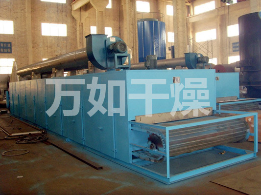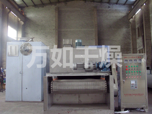 The material on the belt from the feeder evenly over the mesh belt generally adopts 12-60 mesh stainless steel mesh, drag from the gear in the dryer moving. Drying machine consists of several units, each unit independent hot air circulation, humidity and the fan portion of the tail by specialized discharged from the exhaust gas control valve, the heat from bottom to top or from top to bottom through the material covered belt complete with heat mass transfer process, material moisture away. Belt moves slowly, running speed can be freely adjusted according to the material temperature, the finished product after drying receive continuous fall feeder. Upper and lower circulation unit can be flexibly equipped according to user needs, according to the number of units you may also need to select.