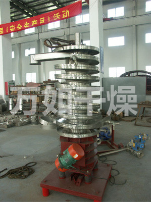 Wet material from the top of the feed inlet into the spiral bed, under the effect of centrifugal force and the circumferential direction of gravity, the material along the helix bed from the bottom up as a jumping motion; at the same time, clean and hot air into the bottom of the bed by the spiral, and distribute the material in the bed full of heat and mass transfer, the humidity discharged from the top of the mouth. So that the material to achieve the purpose of drying.